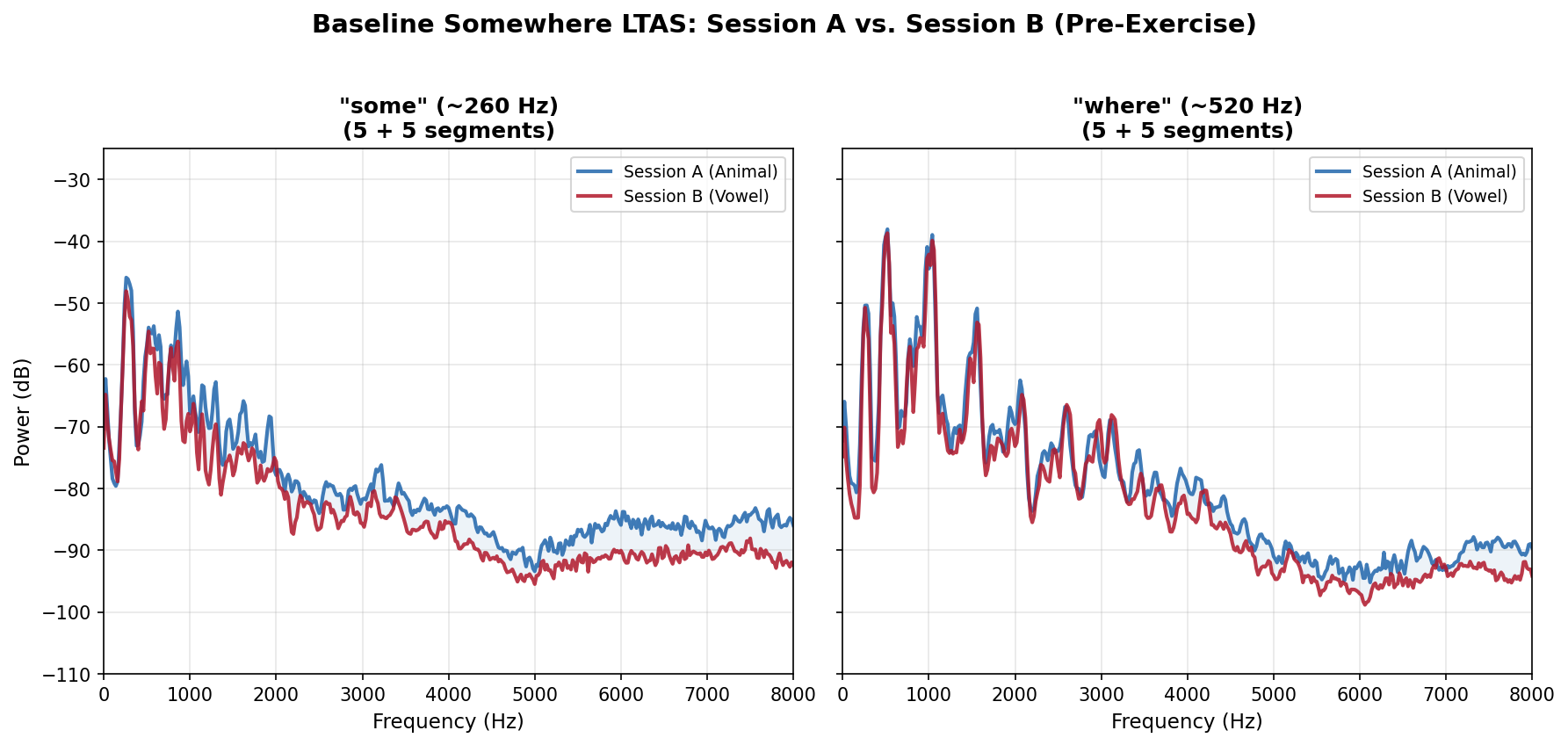 The LTAS (Long-Term Average Spectrum) figures show what the heatmap numbers look like acoustically. The first figure below shows the baseline Somewhere (pre-exercise) at both registers, confirming that Sessions A and B started from the same spectral profile. The three per-pair figures then show mimic, exercise, and post-exercise Somewhere. The Somewhere panels use pitch-conditioned LTAS: only the frames where the singer is in the target register contribute to the spectral average. Blue = animal session (A), red = vowel session (B).