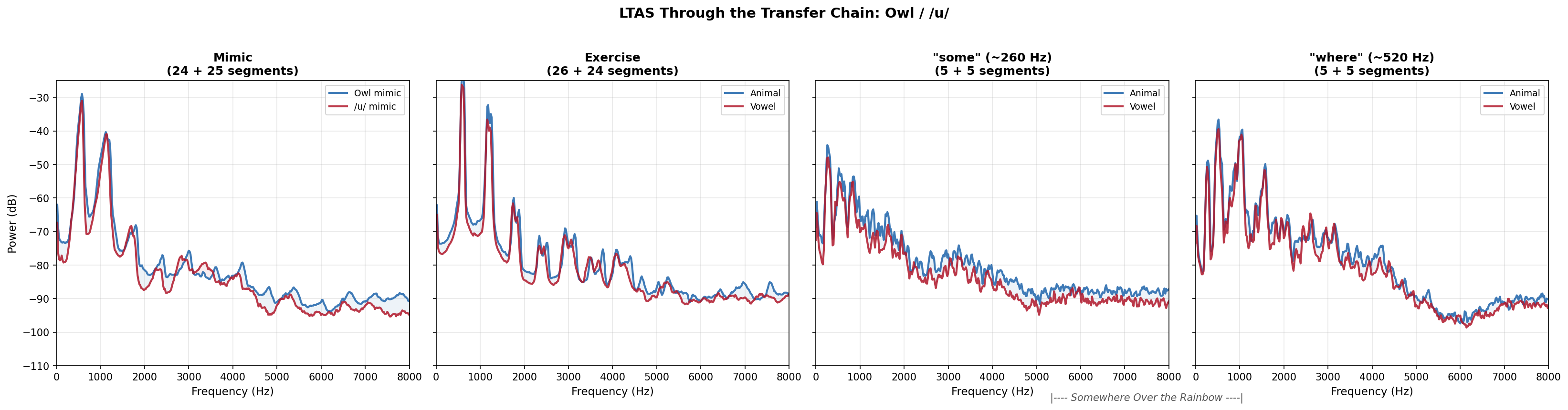 - Formant reliability: Unreliable at f0 > 350 Hz. Owl mimics (~570 Hz) and “where” targets (~520 Hz) are flagged; formant-dependent findings should be interpreted with caution for high-f0 tokens.