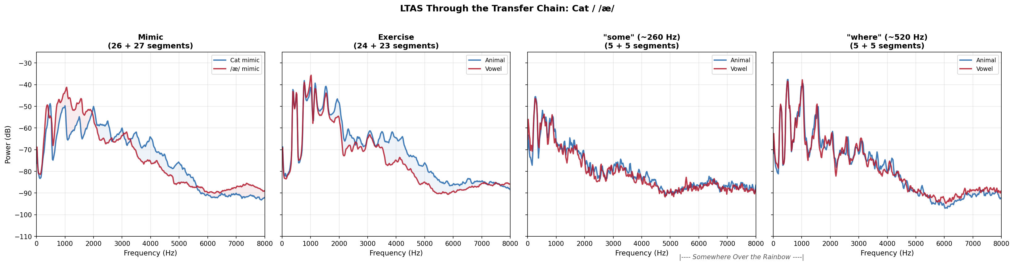 Cat / /æ/: dramatic spectral divergence at mimic, partially visible at exercise. The “where” panel shows residual difference in the song.
