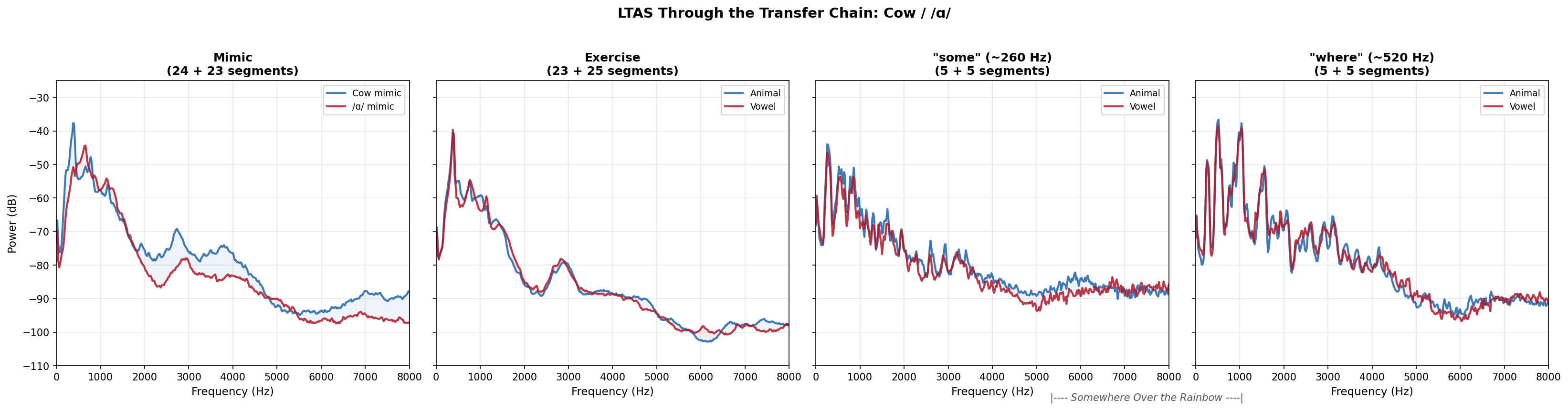 Three pairs, three different acoustic stories. The owl confirms the baseline. The cat amplifies harmonic energy in the mid and high frequencies. The cow persists through the transfer chain into the song.