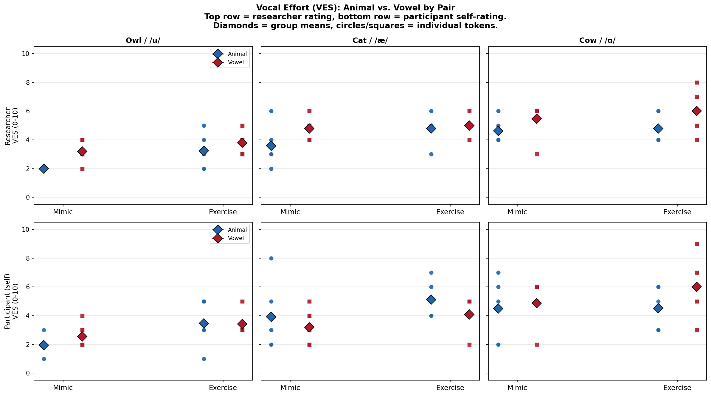Perceptual measure: Omni-VES (Vocal Effort Scale, 0-10), rated by the researcher for every mimic and exercise segment. Participant self-ratings provide a second perspective.